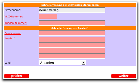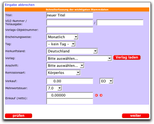 Über die jeweiligen Masken anlegen haben Sie die Möglichkeit, alle relevanten Daten des Objektes oder Verlages über eine Schnellerfassung einzugeben. Erst im Anschluß können Sie diese Daten entsprechend verfeinern. So zum Beispiel