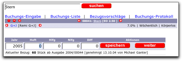 Nur die Hauptbenutzer können jedoch Bezugsveränderungen an die Verlage via e-mail, fax oder ispc übermitteln. Alle nicht benötigten Vorschläge können nur von diesen entfernt werden. Die jewilige Veränderung wird dann auf der Wareneingansseite des Objektes angezeigt, so dass zukünftige Bezüge geplant und überprüft werden können.